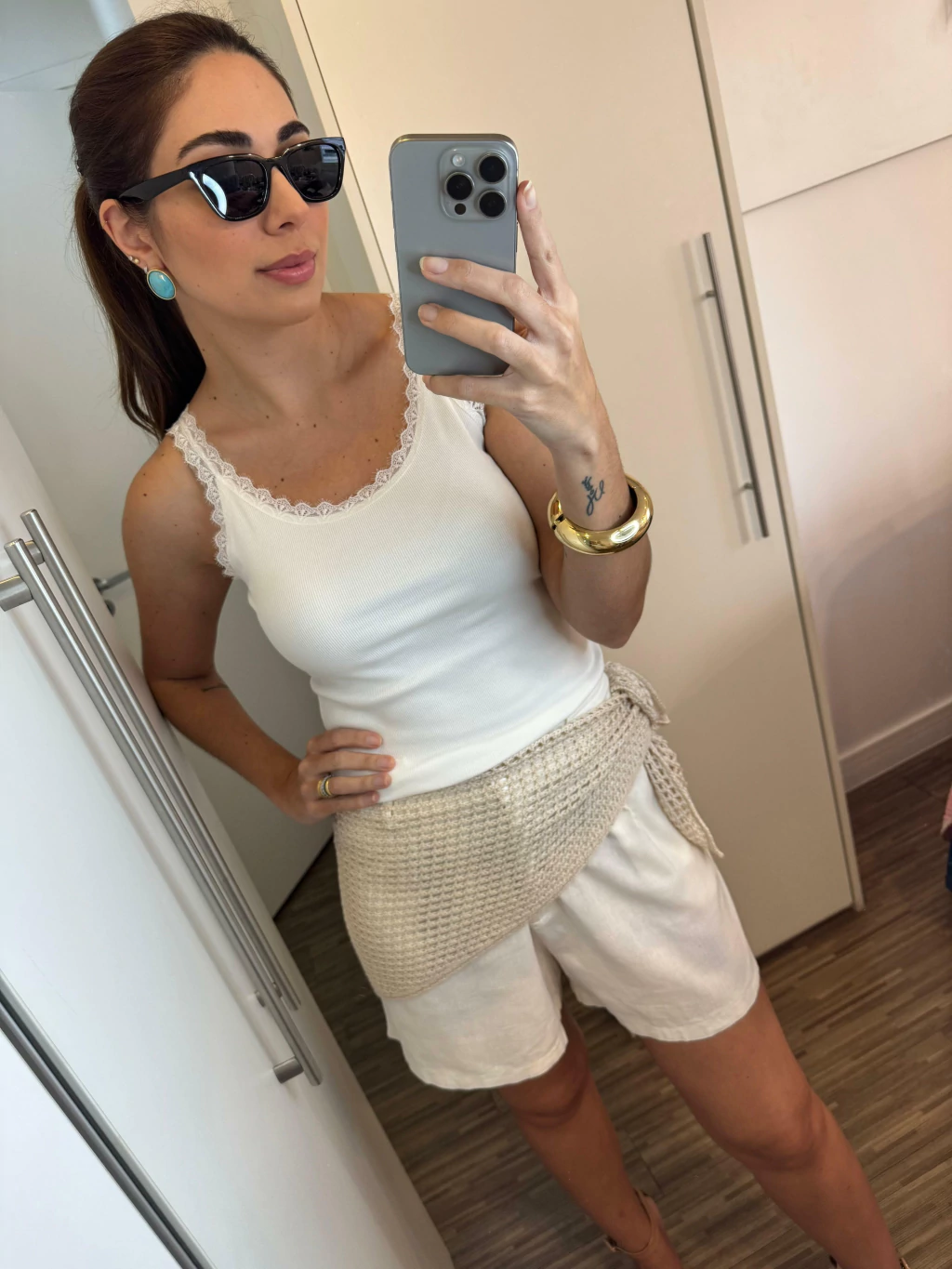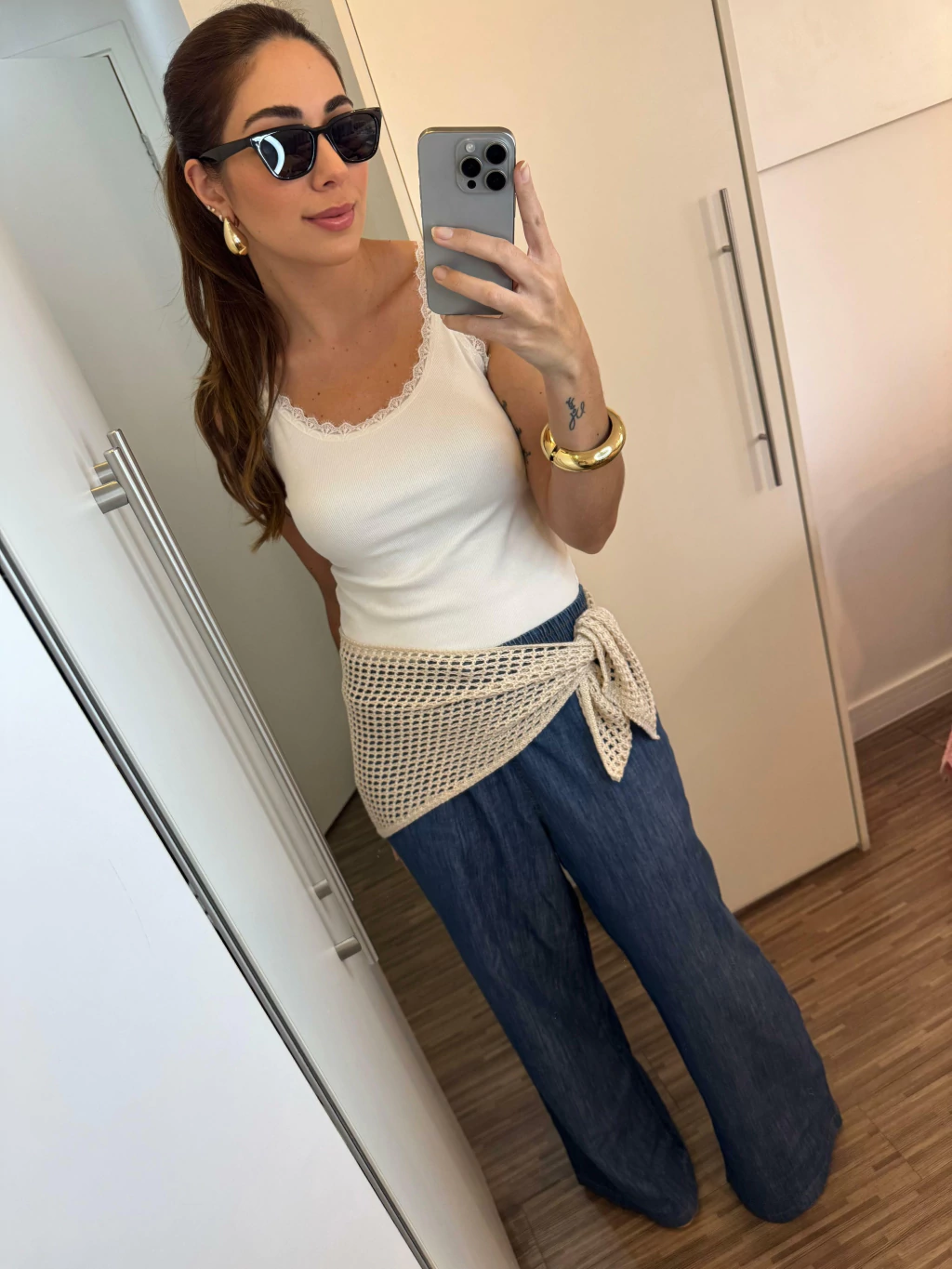 Disponível nos tamanhos P (36-38), M (38-40) e G (40-42), essa regata é perfeita para quem busca estilo aliado à praticidade. A Fernanda veste P e aprova o caimento perfeito!